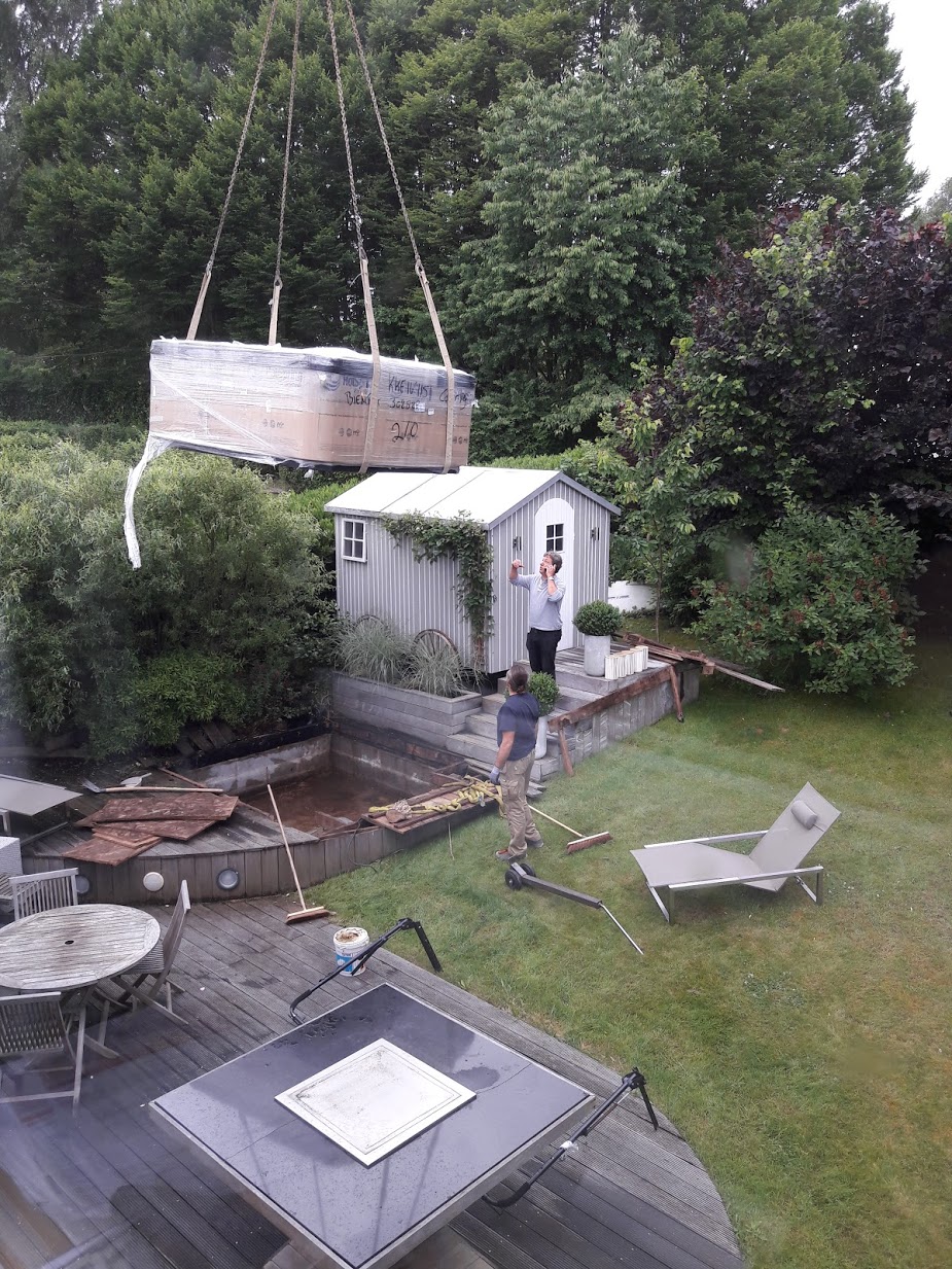 rotation de stock oblige, changement de spa dans le jardin. toujours aussi impressionnant de voir ce monstre se trimbaler au dessus de la maison au bout d’une corde…